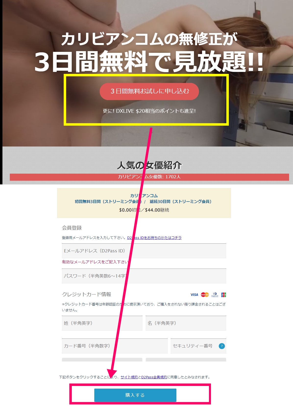 - DTIの場合、キャンペーン中(例えばカリビアンコム等の3日間見放題プラン→過去入会経験あれば通常の申込み)の場合、申込みページがそのまま出るため、「申込みボタン」をクリック